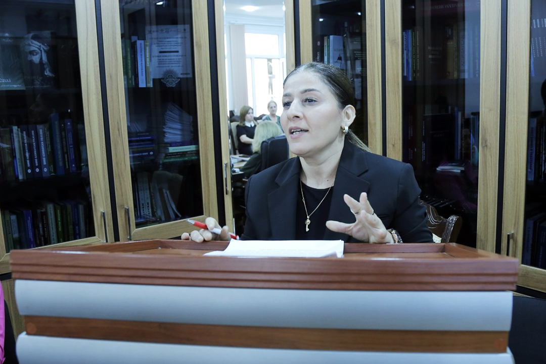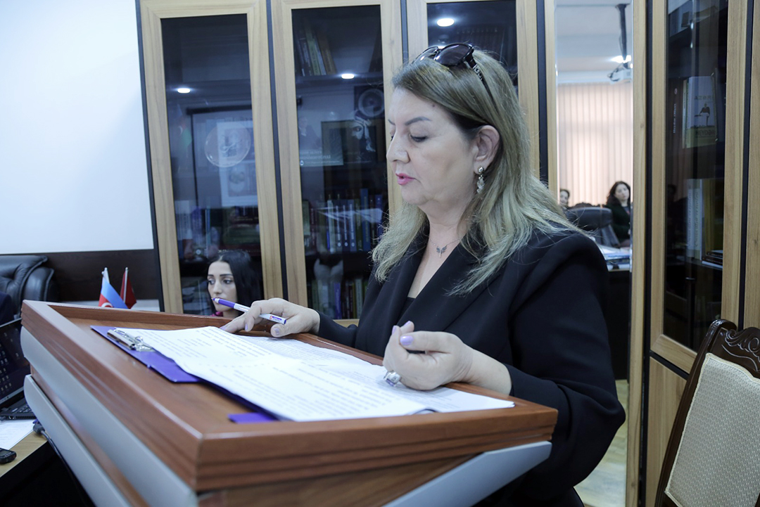 Filologiya üzrə fəlsəfə doktoru, dosent Gülsümxanım Hasilova isə “Bəxtiyar Vahabzadə yaradıcılığında xalq deyimləri” mövzusunda çıxış edərək, şairin əsərlərində yer alan xalq deyimləri və atalar sözlərini təhlil edib. Alim qeyd edib ki, Bəxtiyar Vahabzadə xalq deyimlərindən yalnız sitat olaraq istifadə etməmiş, onları yenidən yaradaraq poetik biçimdə yeni həyat vermişdir. Bu yanaşma şairin milli kimliyi qorumaq və xalq müdrikliyini gələcək nəsillərə çatdırmaq məqsədinə xidmət edir. “Onun əsərlərindəki atalar sözləri və məsəllər xalq ruhunun ifadəsi olan nümunələr kimi xalq ədəbiyyatı ilə yazılı ədəbiyyat arasında möhkəm bir körpü yaradır,” – deyə Gülsümxanım Hasilova vurğulayıb.