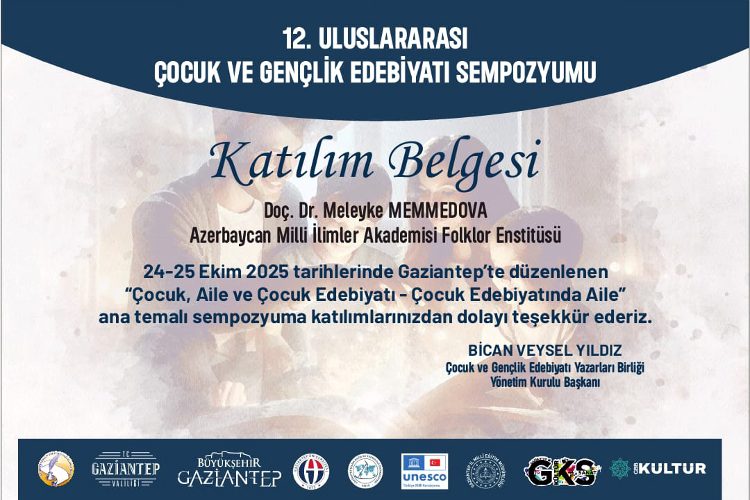 AMEA Folklor İnstitutunun Mifologiya şöbəsinin aparıcı elmi işçisi, filologiya üzrə fəlsəfə doktoru, dosent Məleykə Məmmədova Türkiyənin Qaziantep şəhərində təşkil olunan “12-ci Beynəlxalq Uşaq və Gənclik Ədəbiyyatı Simpoziumu”nda elmi məruzə ilə çıxış edib.